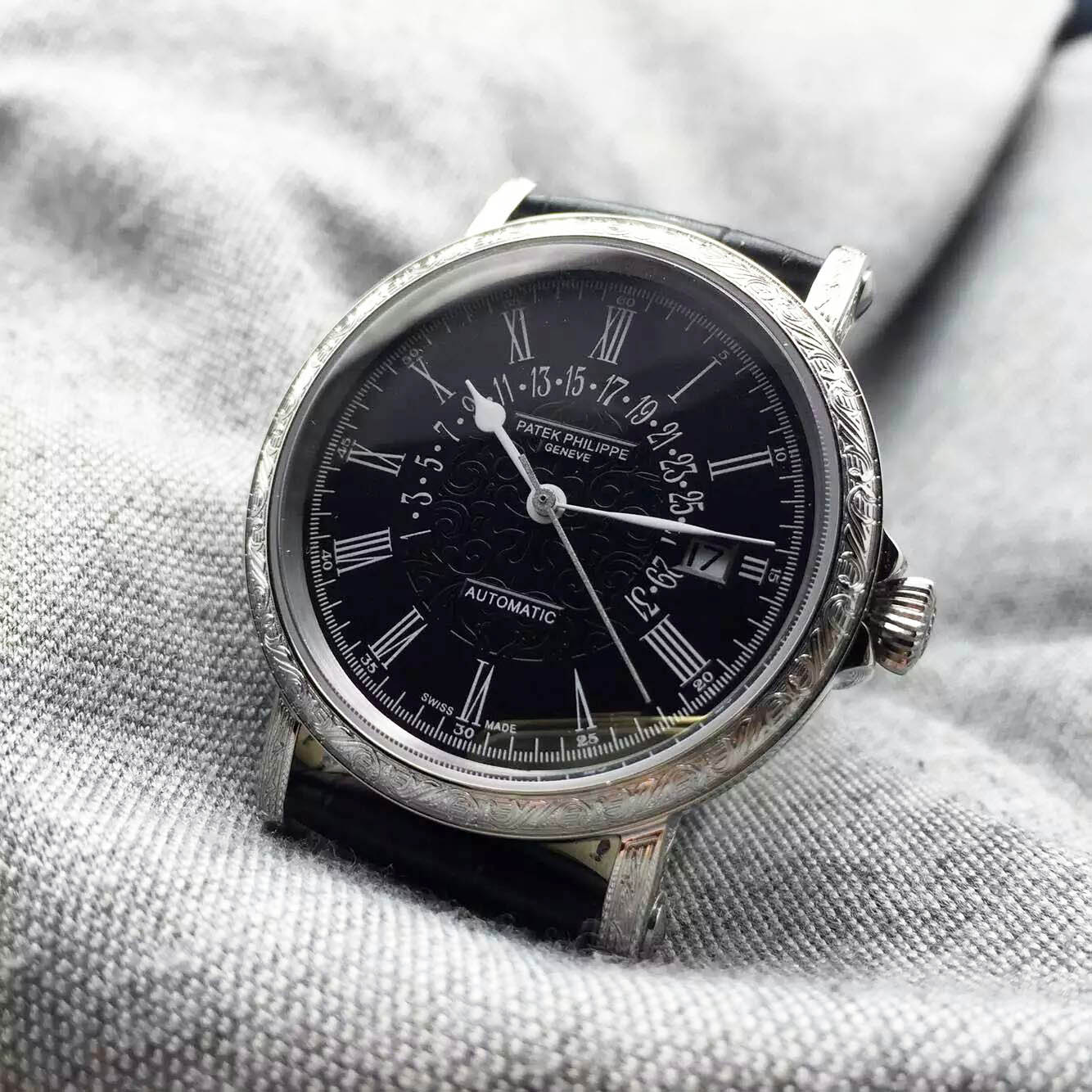 描述:始終堅持原版1:1複刻 永不磨損!!3字位日曆顯示 羅馬刻度 整體呈現出古典深邃的美感 浮雕圖案錶殼 字面中部印有標志圖騰