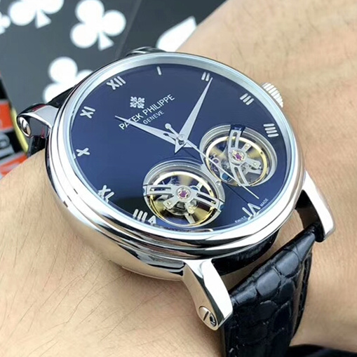 百達翡麗 Patek Philippe 簡約錶盤雙飛輪 士鋼帶真牛皮錶帶腕錶