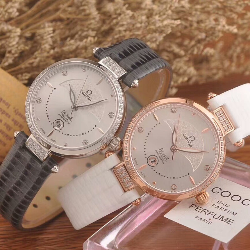 歐米茄OMEGA女款石英腕表尺寸33mm厚7mm搭載進口原裝石英機芯牛皮錶帶白色錶盤針扣