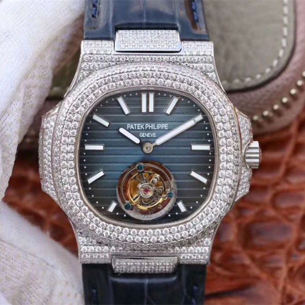 R8廠 百達翡麗鸚鵡螺號 5711, 2018年 不銹鋼和鉆石藍錶盤瑞士陀飛輪 搭載瑞士陀飛輪手動上弦機芯