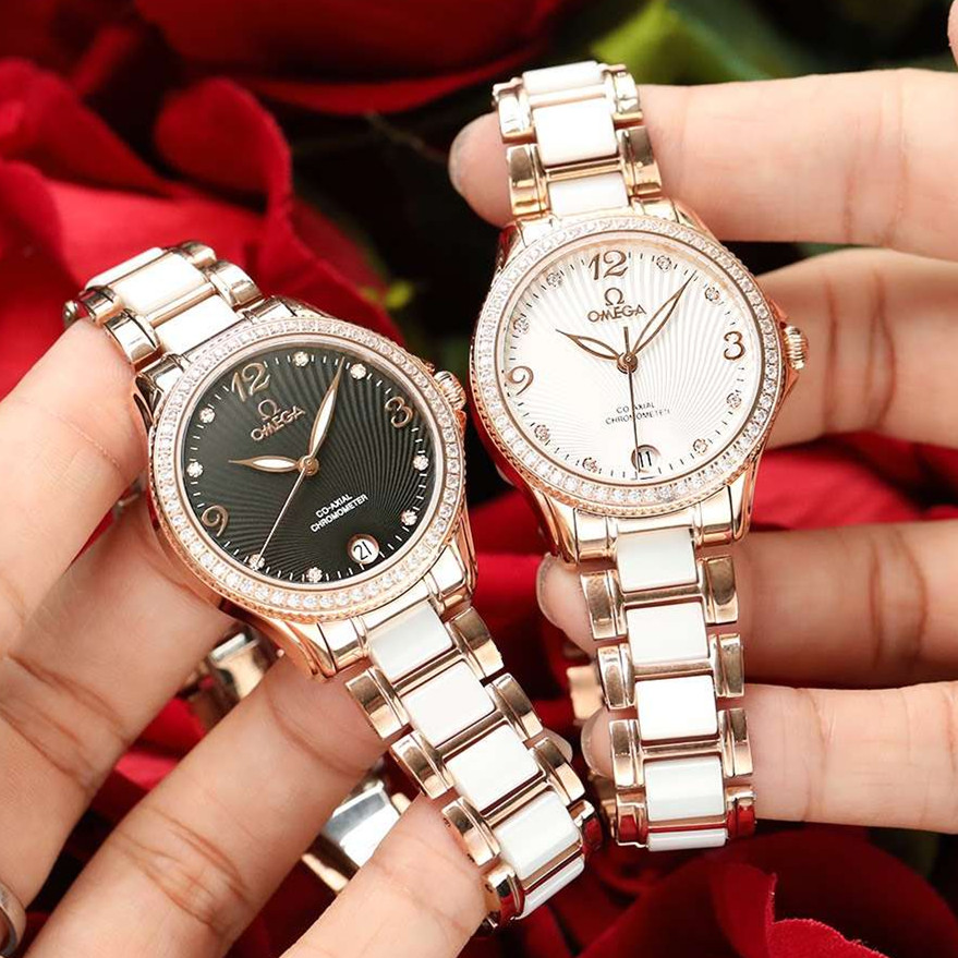 歐米加爆賣新款,送給女神不二之選,藍寶石仿刮鏡面316精鋼錶殼18k微納米電鍍玫金,純白陶瓷圈口尺寸32×10mm搭載原裝進口821a機芯,21600每小時振盪次數,動力儲備48小時,錶帶:陶瓷,三度防水效能