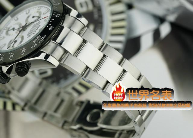 材質:高硬度耐磨玻璃鏡面,全鋼錶殼錶帶,黑色計時速度字圈。