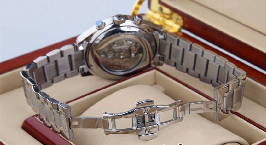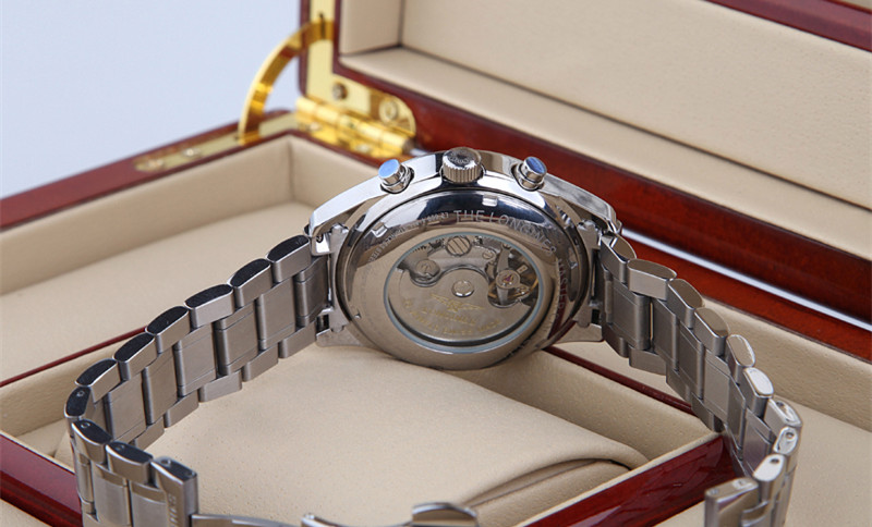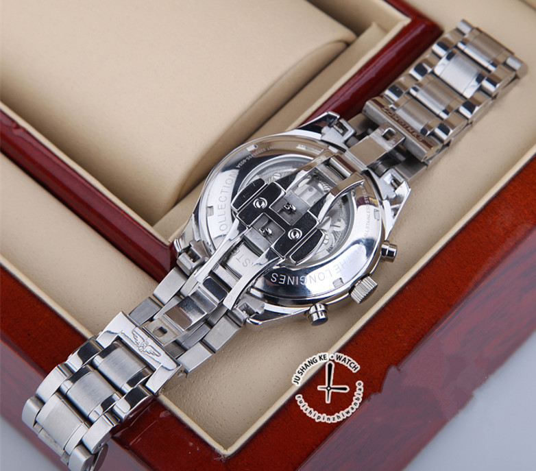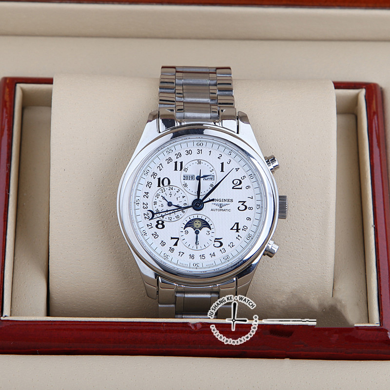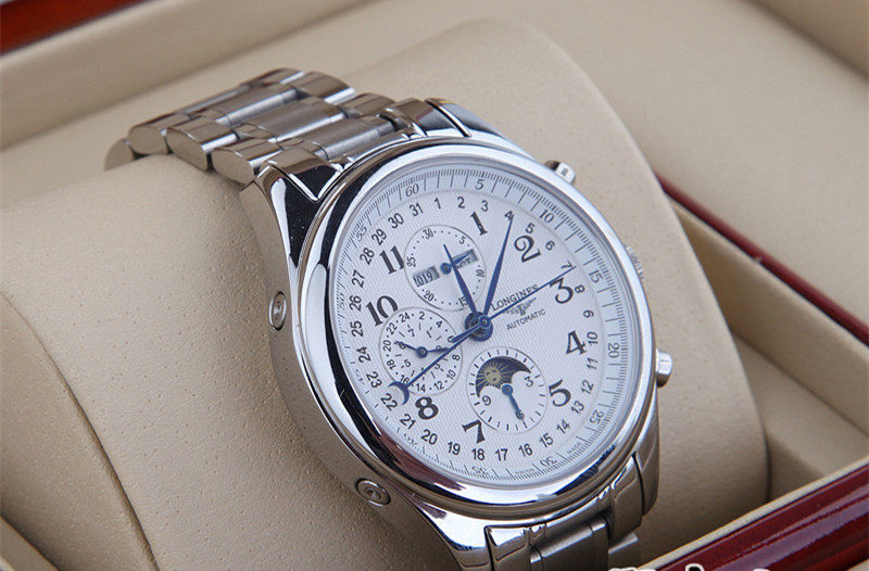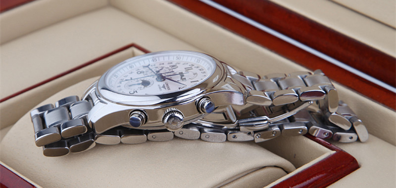 系列:名匠系列款式:男錶機芯:瑞士進口全自動雕花機芯錶殼:316精鋼尺寸:40mm厚度:15mm錶底:透底錶鏡:藍寶石水晶錶盤:白色錶帶:鋼帶錶帶顏色:銀色錶扣:蝴蝶扣防水:30米包裝:精美包裝盒、說明書、保修卡等功能:日期顯示 星期顯示 月份顯示 月相 計時碼錶 雙時區