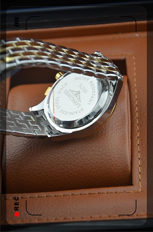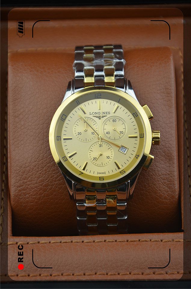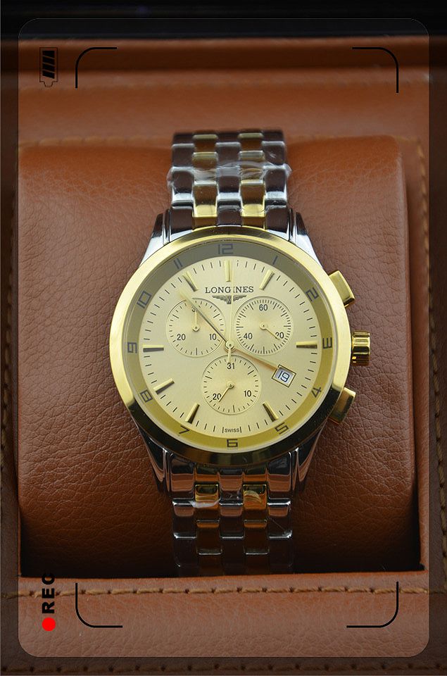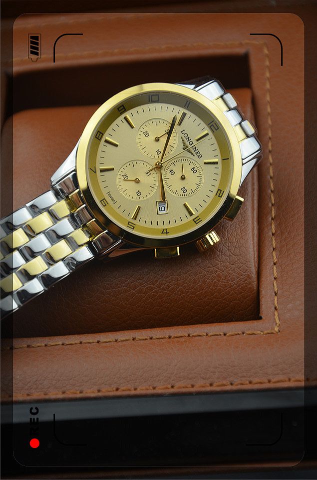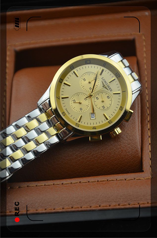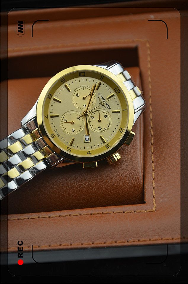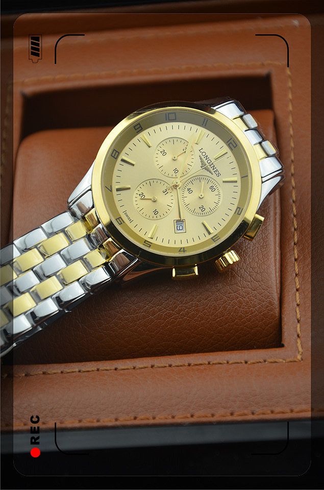 浪琴進口瑞士石英機芯金色錶盤三小錶盤單日曆男士腕錶