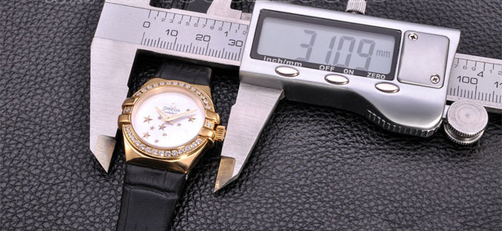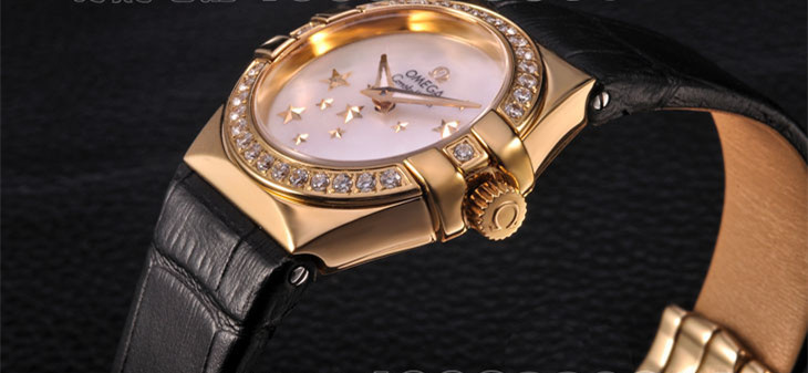 品牌:歐米茄系列:星座系列款式:女款厚度:約9mm尺寸:27mm錶盤:白色貝母字面錶帶:真皮錶帶(黑色)錶殼:精鋼錶殼及玫瑰金鑲鉆錶圈防水:生活防水機芯:原裝瑞士石英機芯配件:原裝盒,說明書,質保卡,吊牌鏡面:藍寶石水晶鏡面