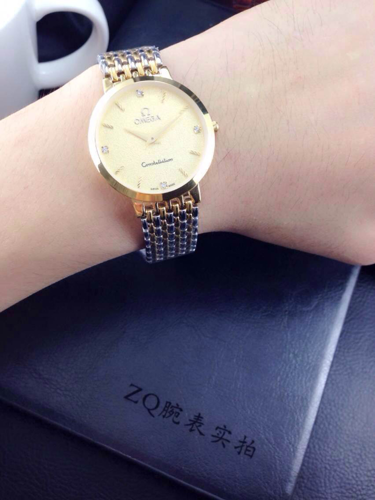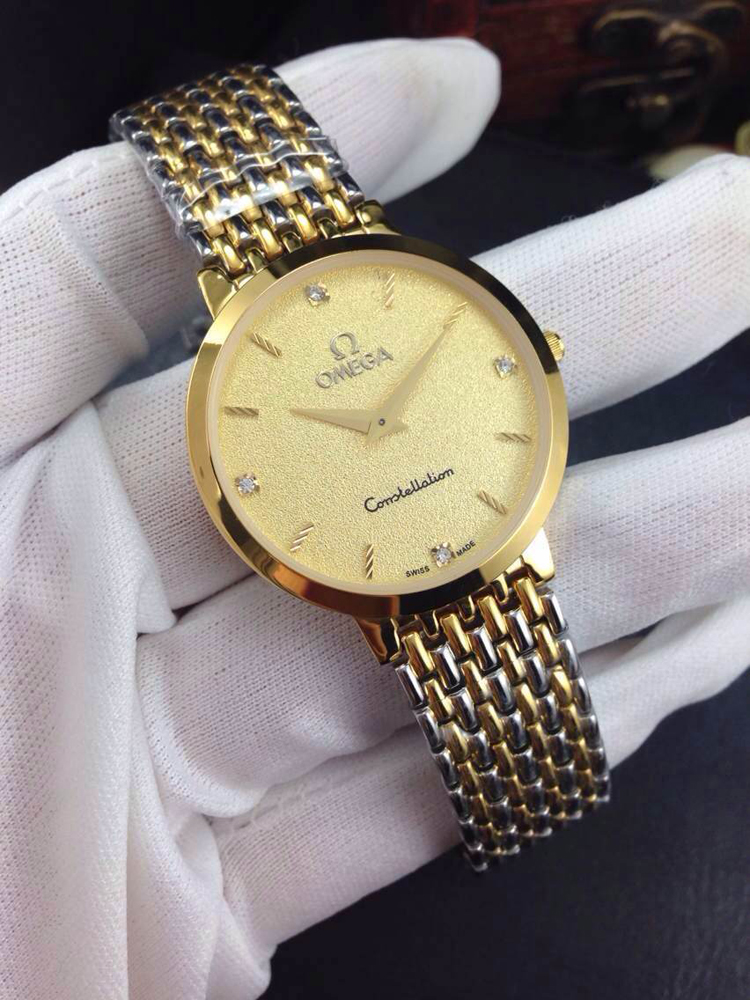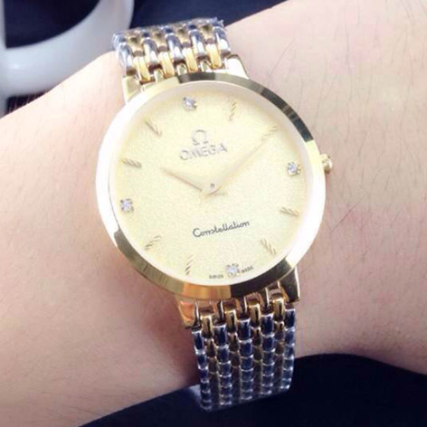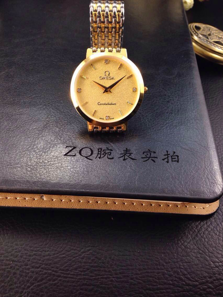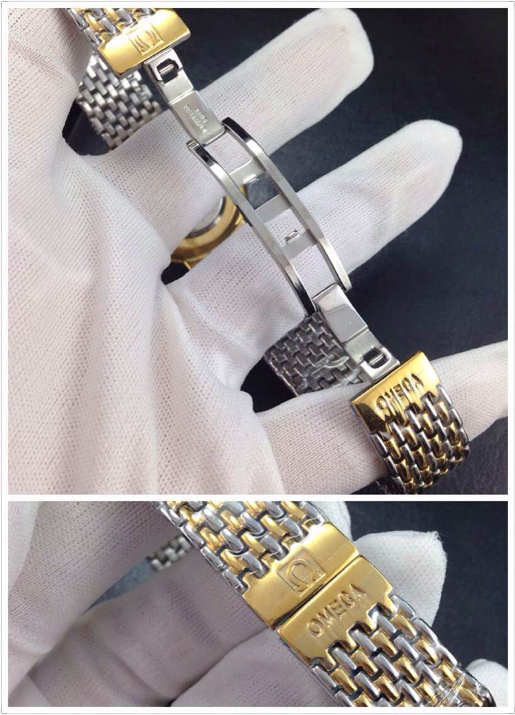 品牌:歐米茄超薄系列情侶對錶材料:黃金色錶面酸間金錶殼,精鋼鋼帶