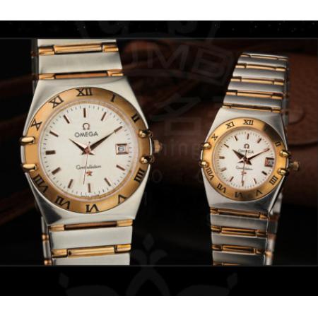歐米茄OMEGA 星座精鋼間金羅馬數字外圈柳條刻度日曆視窗優雅時尚瑞士石英情侶腕錶