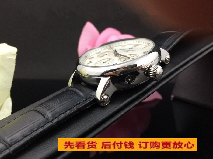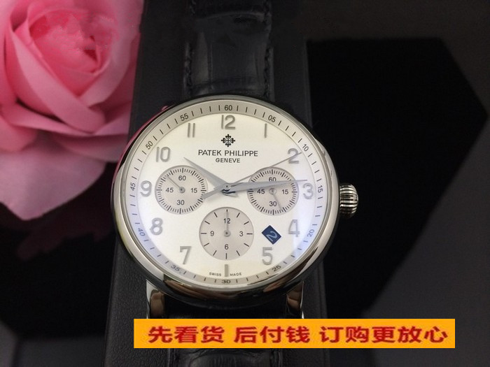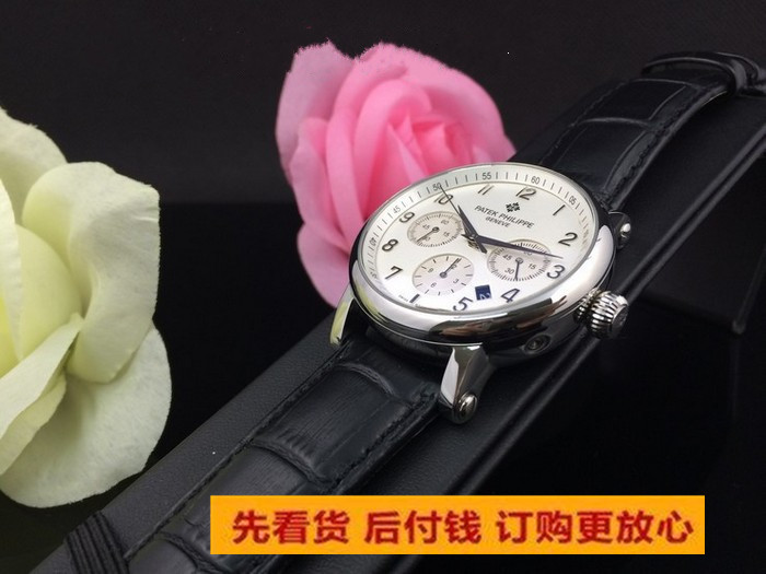 百達翡麗六針多功能計時機械男款 白面真皮錶帶