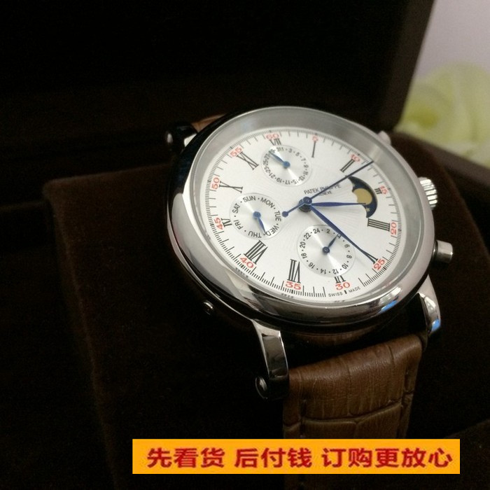 百達翡麗 精鋼高精密3曆晝夜指示自動機械錶男錶棕色皮帶