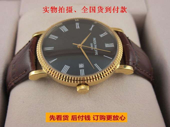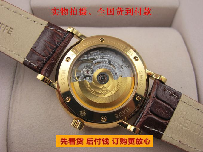 【功能】內部儲能很強,長時間不戴依然走時準確,帶日歷,30米防水、防震、防磁;金色金錶殼打造高貴典雅,錶面金質立體時標,12位置浮雕百達翡麗(Patek Philippe)標誌