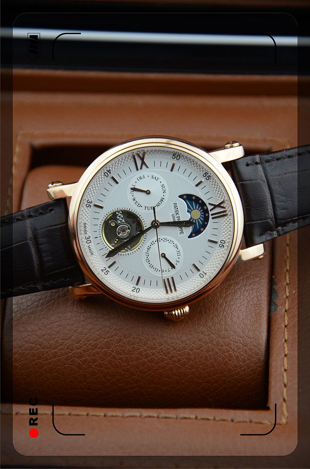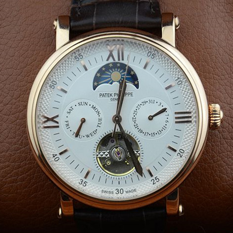 精鋼玫瑰金5針3日曆晝夜指示白面皮帶時尚優雅陀飛輪自動機械男錶
