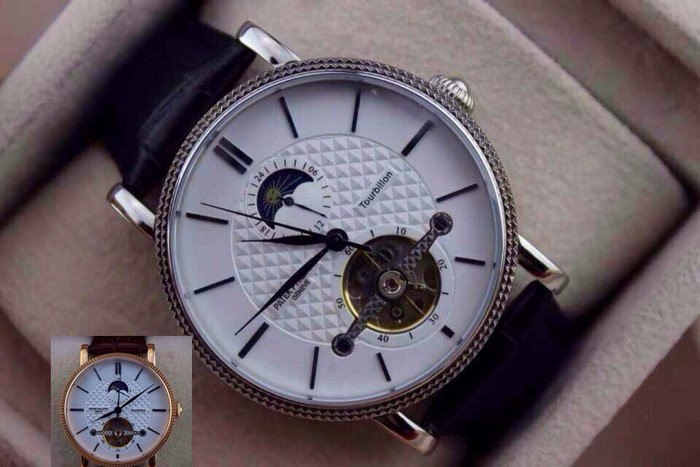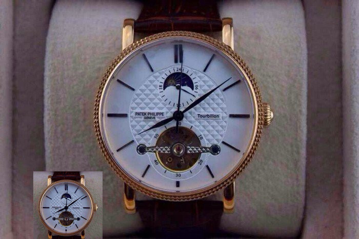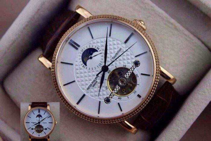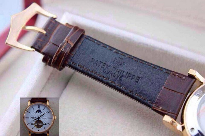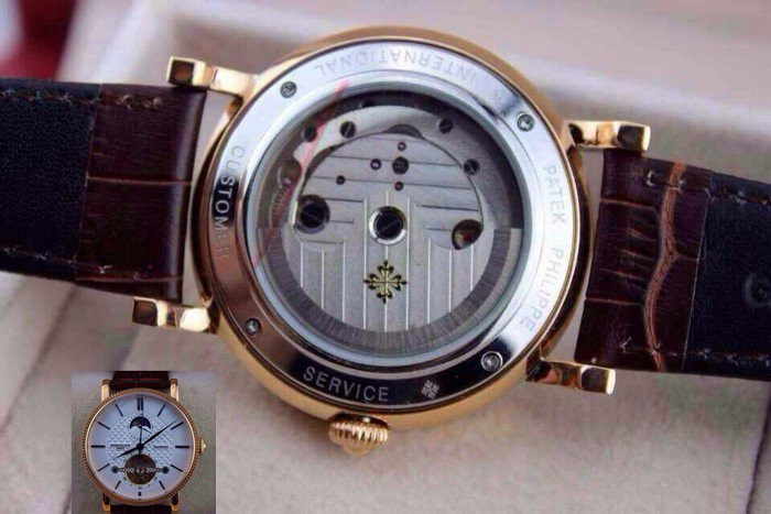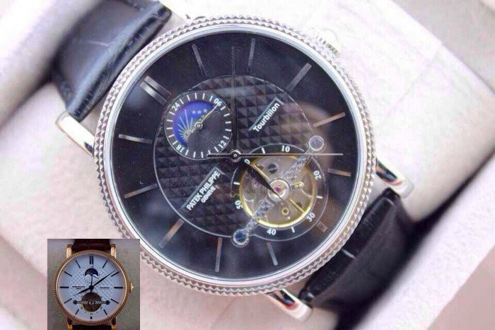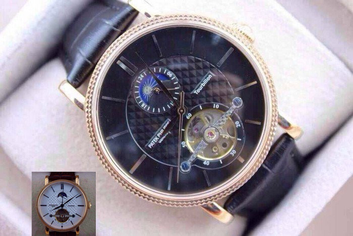 【品牌】:百達翡麗(PATEK PHILIPPE)【款式】:男士機械手錶【機芯】:進口全自動機械機芯【錶面】:法國玻璃藍寶石鏡面,永不磨損。莫氏9級藍寶石錶面【材料】:進口瑞士玫瑰金/316精鋼錶殼 法國小牛皮錶帶,永不掉色、永不生銹,高精度藍寶石玻璃永不劃損【尺寸】:直徑:43MM,厚度:13MM【標誌】:錶面、錶背、錶扣均有原廠標誌【功能】:30米防水、防震、防磁【附件】:原裝包裝盒、吊牌、保質卡、說明書、香港發票