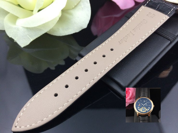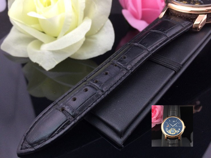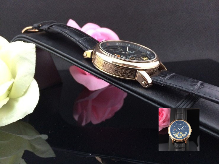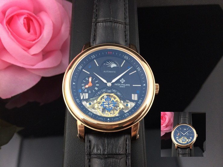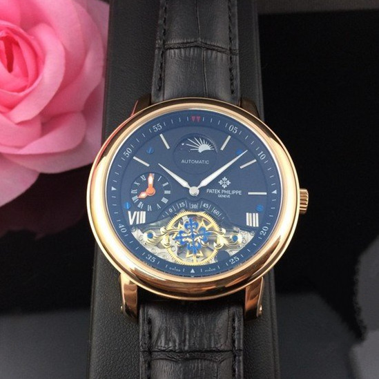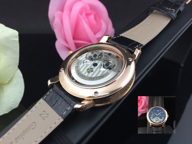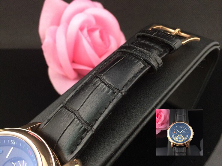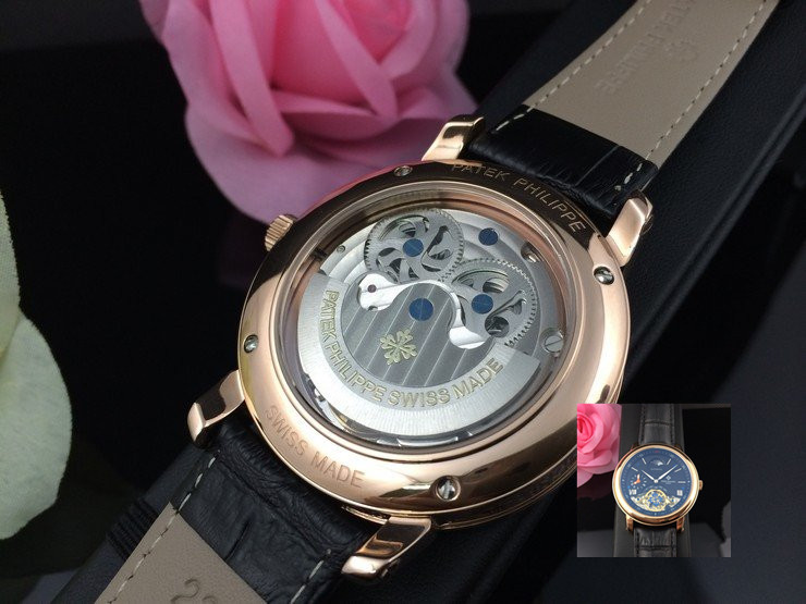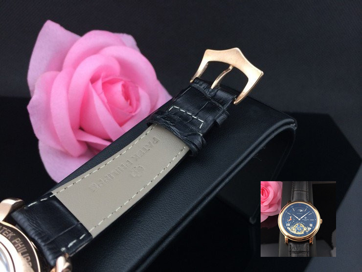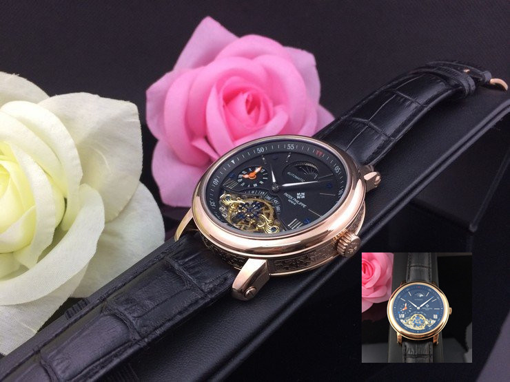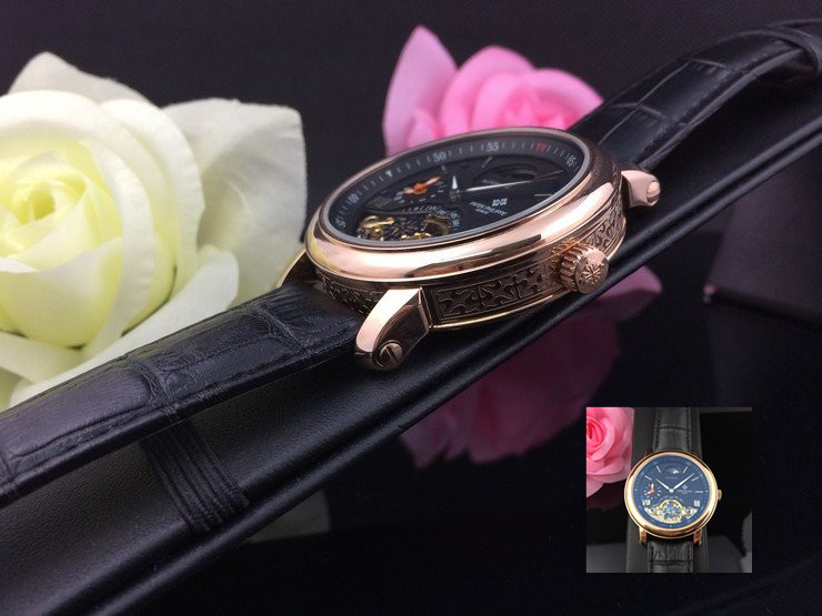 百達翡麗 全玫瑰金雙計時黑面真皮男機械錶