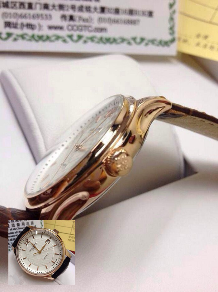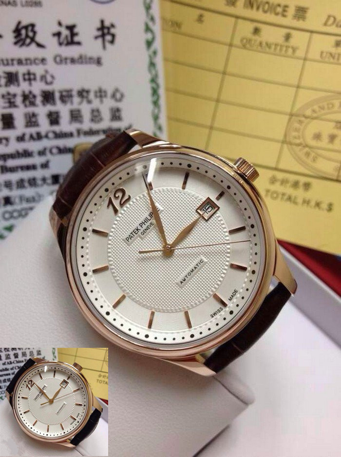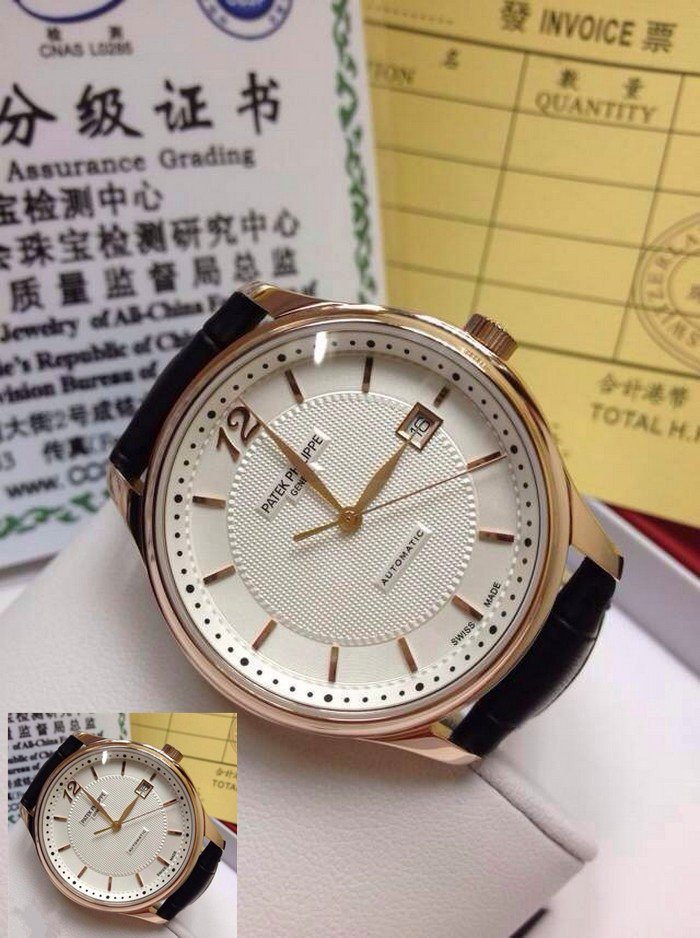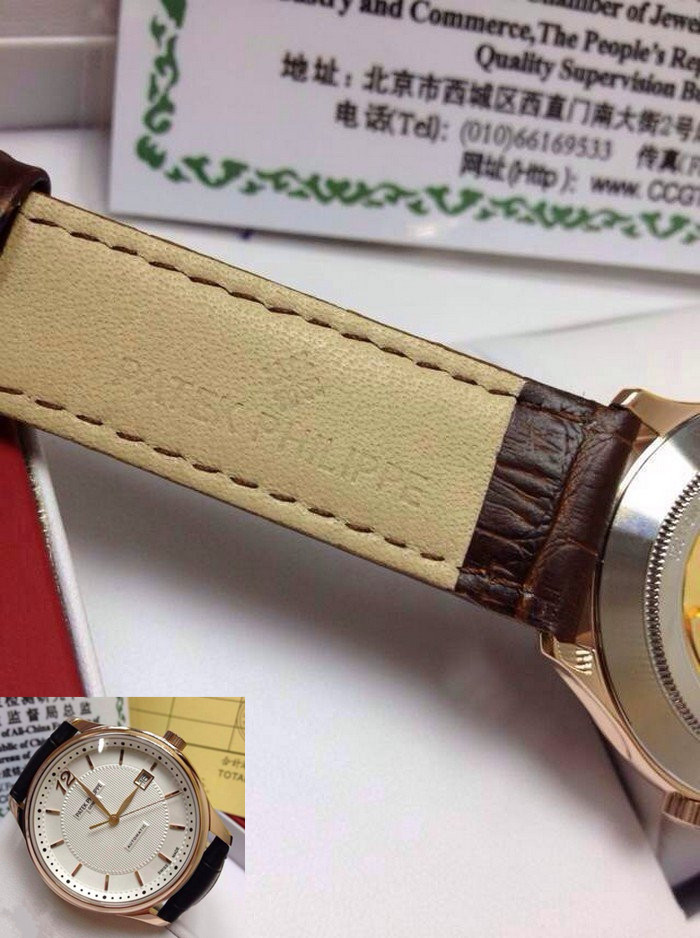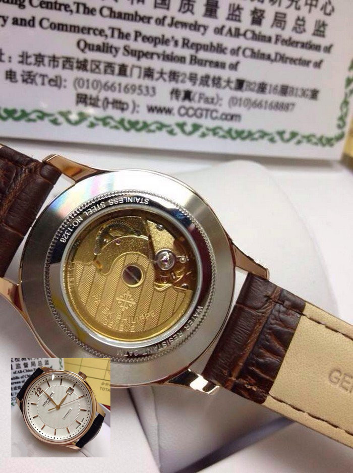 【品牌】:百達翡麗(PATEK PHILIPPE)【款式】:男士機械手錶【機芯】:進口瑞士ETA2824機械機芯【錶面】:法國玻璃藍寶石鏡面,永不磨損。莫氏9級藍寶石錶面【材料】:進口瑞士玫瑰金錶殼 法國小牛皮錶帶,永不掉色、永不生銹,高精度藍寶石玻璃永不劃損【尺寸】:直徑:39MM,厚度:10MM【標誌】:錶面、錶背、錶扣均有原廠標誌【功能】:50米防水、防震、防磁【附件】:原裝包裝盒、吊牌、保質卡、說明書、香港發票