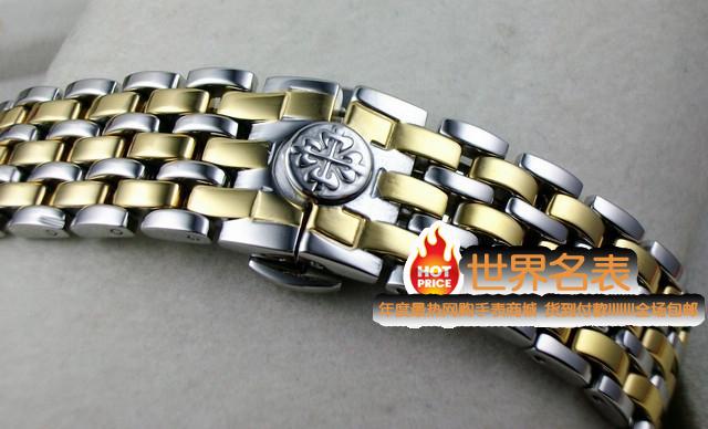 材質:高硬度耐磨藍寶石鏡面(鏡面硬度可達莫氏9級),316L精鋼錶殼,等離子鍍18K黃金色環鉆錶圈,316L精鋼間黃金錶帶,散珠錶帶,打磨精細,線條優美