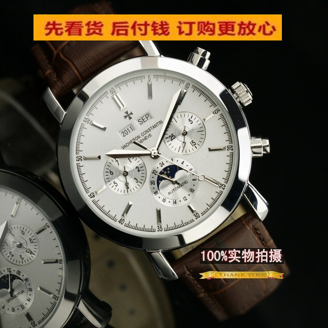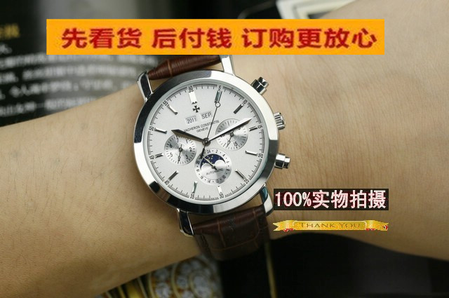 江詩丹頓萬年曆自動機械錶男士手錶白面棕色真皮錶帶機械男錶