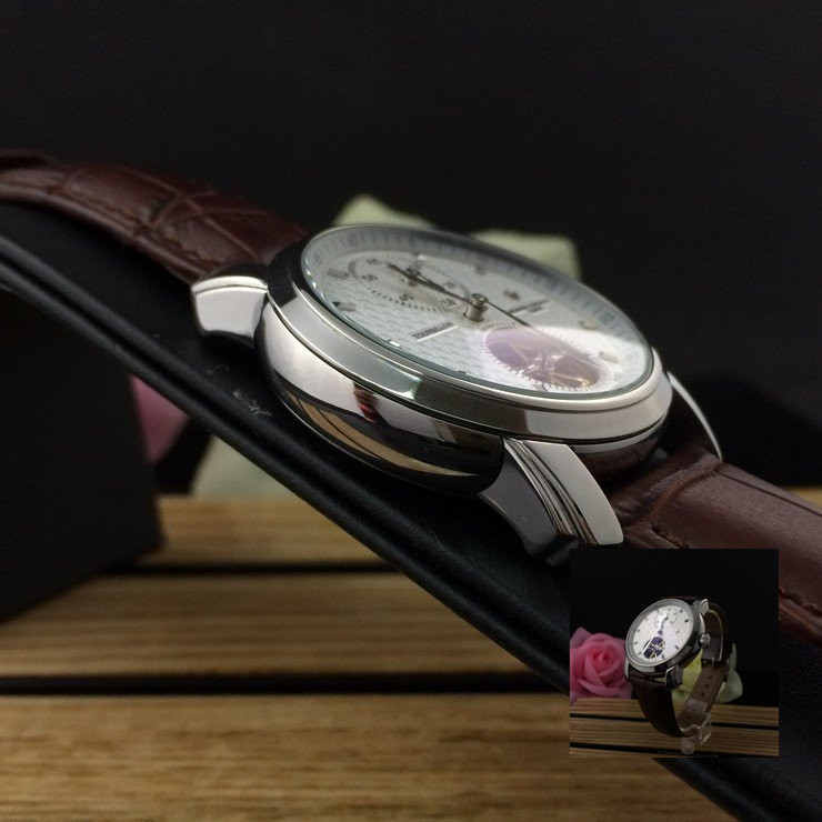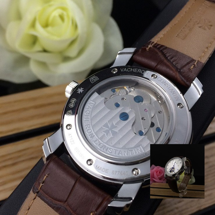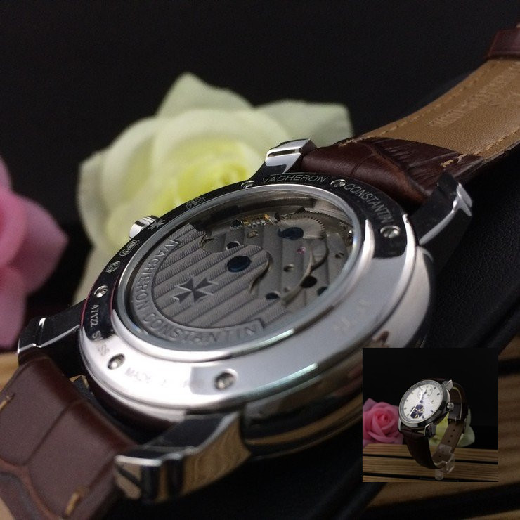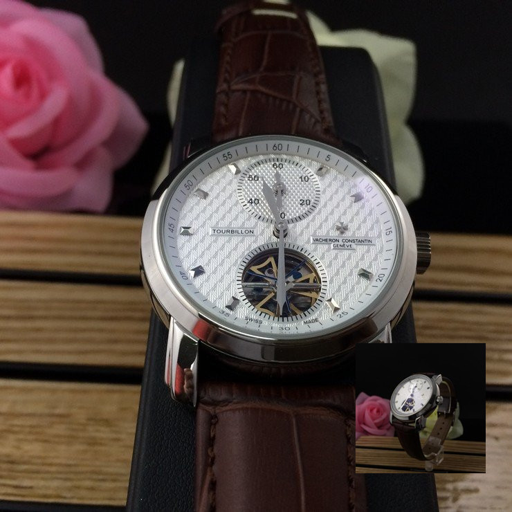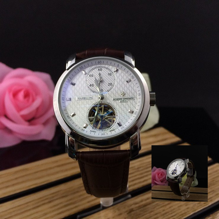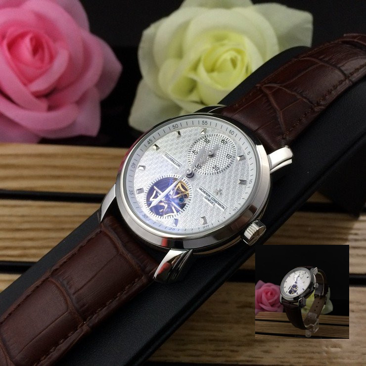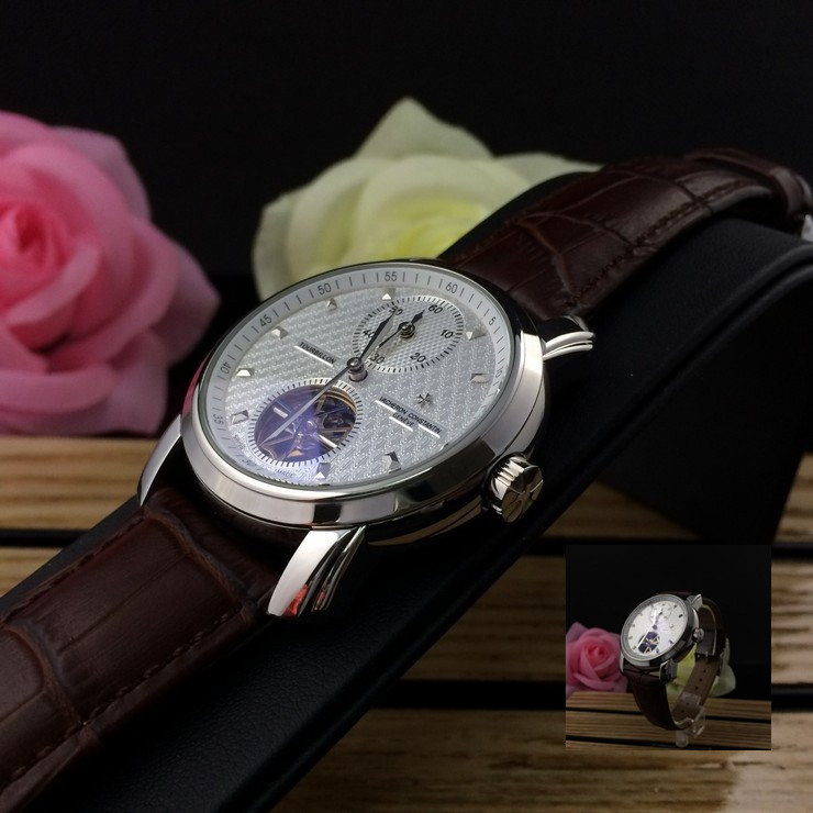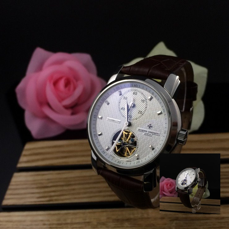 江詩丹頓 精鋼銀面陀飛輪瑞士機械男款棕色真皮錶帶
