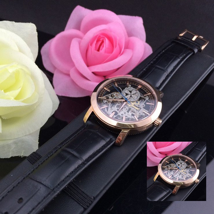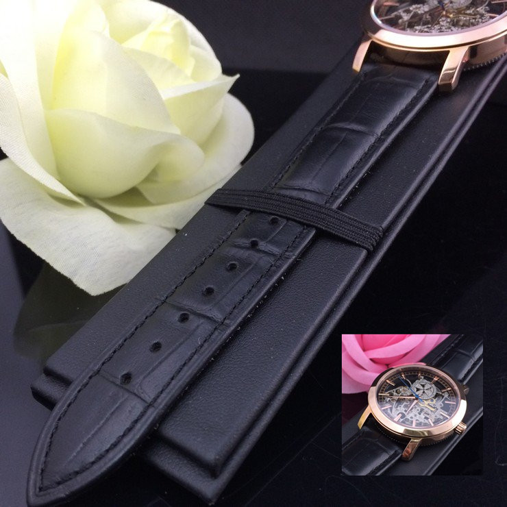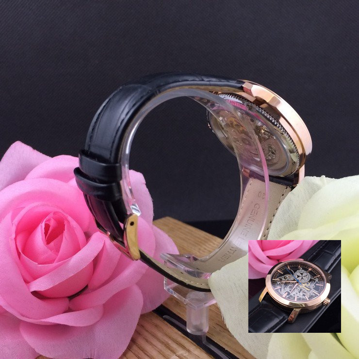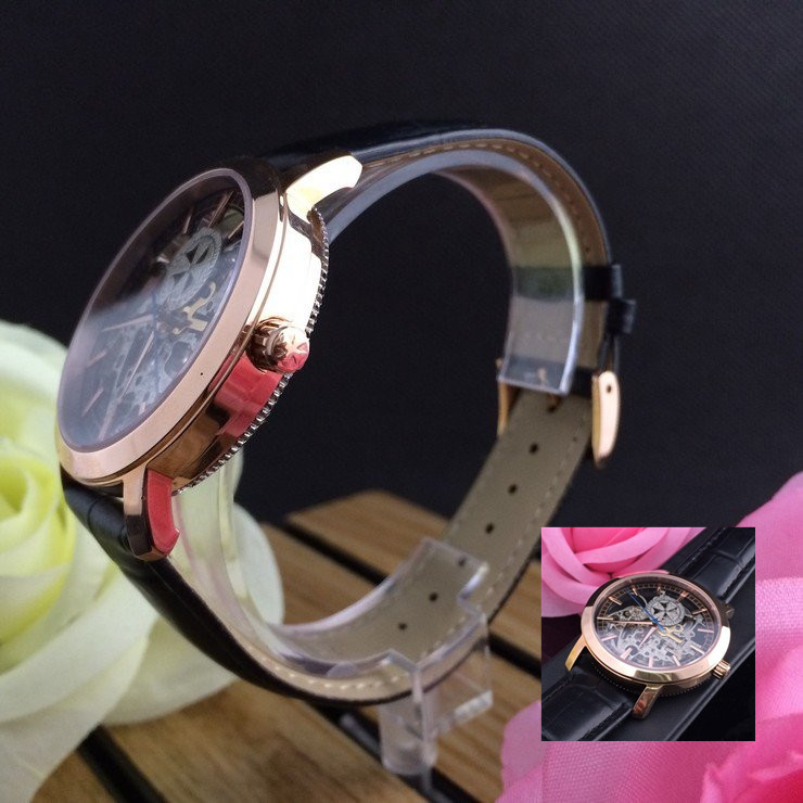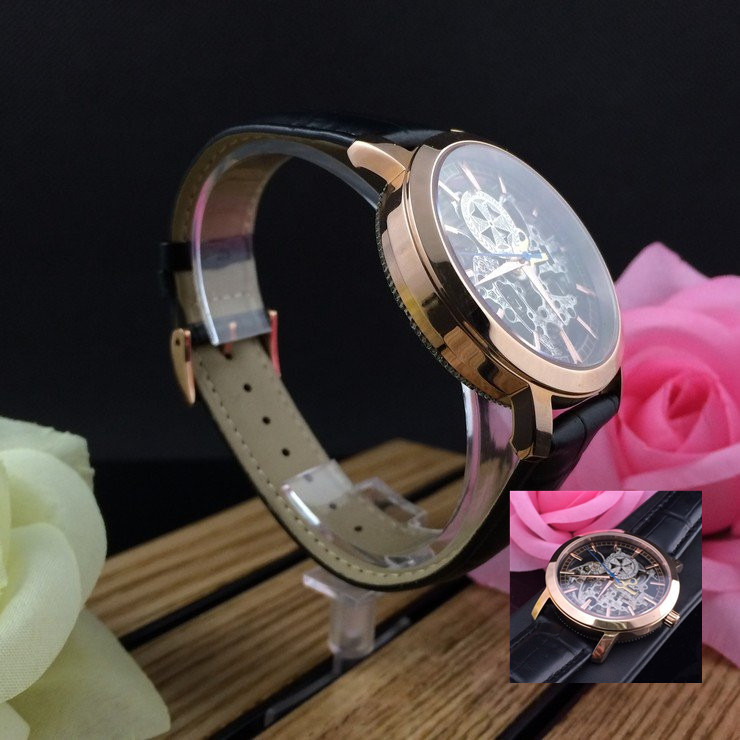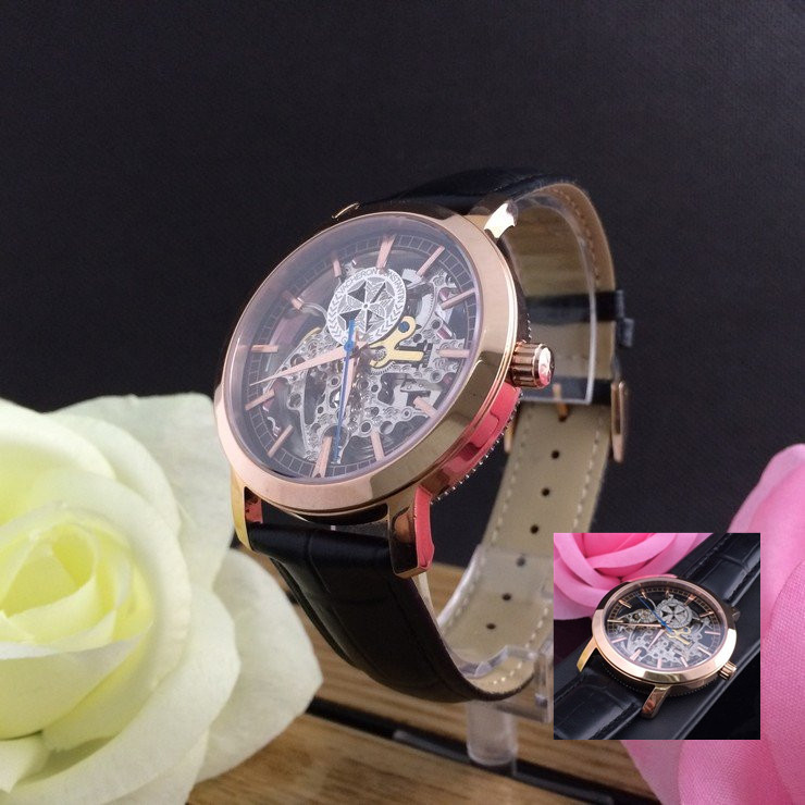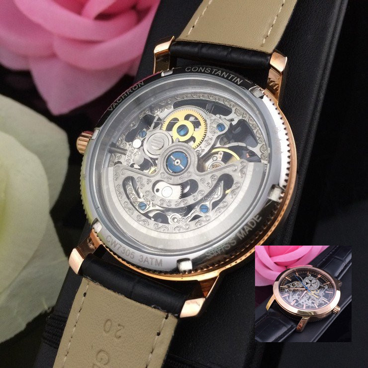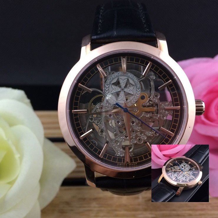 江詩丹頓玫瑰金精鋼錶殼全鏤空機械機芯真皮錶帶男士腕錶