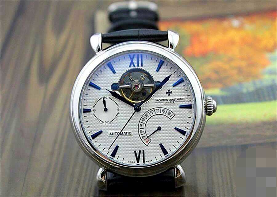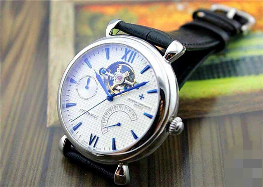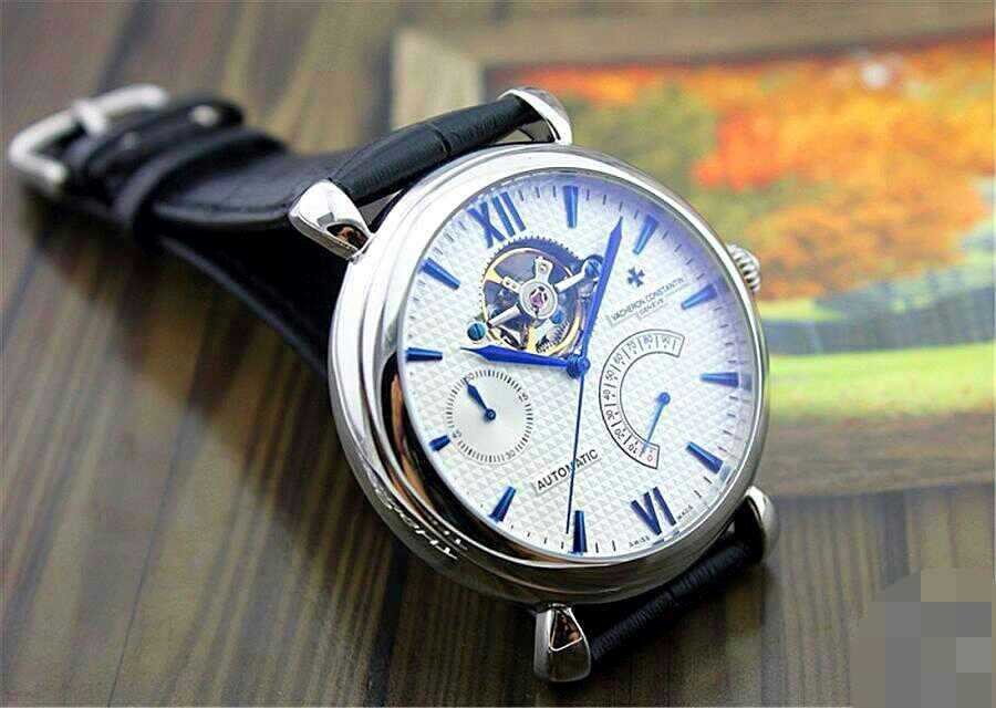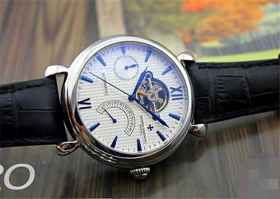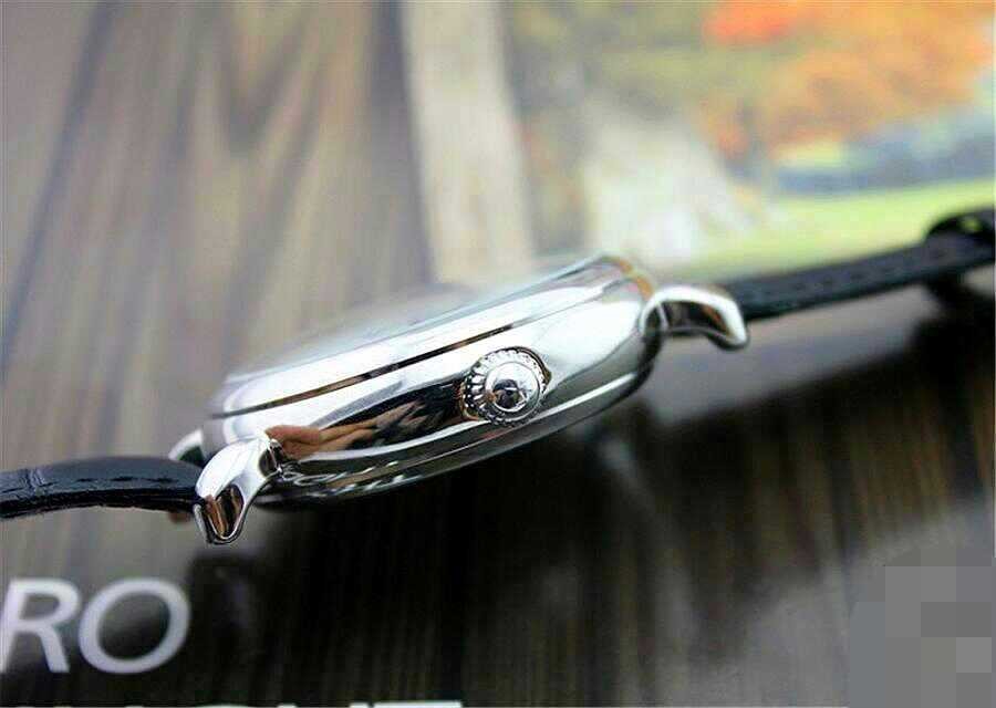 江詩丹頓藍色錶針,藍色條釘加羅馬刻度,全鋼錶殼,黑色皮手錶帶,江詩丹頓男士機械腕錶品牌:江詩丹頓VACHERON CONSTANTIN 機芯:動能飛輪機械機芯