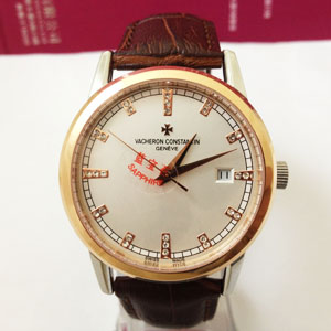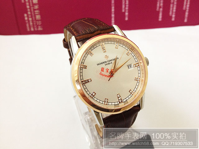 江詩丹頓玫瑰金白色錶盤鉆石刻度,真皮錶帶全自動機械機芯