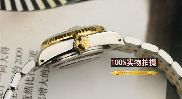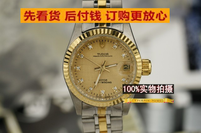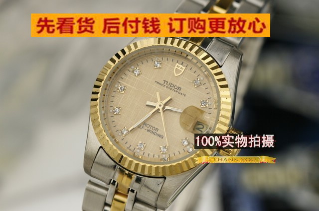 品牌:(帝駝) 公主系列 機芯:進口全自動機械機芯材質:高硬度耐磨藍寶石鏡面,精鋼錶殼,鍍18K金色錶圈,鍍18K間金五珠散珠錶帶。功能:3針計時,金色錶盤,放大鏡凸面日歷顯示窗口,10鉆刻度時計,精致優雅。尺寸:(男)錶殼33mm ,周長220mm ,厚度12mm ,錶帶寬度16-18mm,重量96g (女)錶殼25mm ,周長205mm ,厚度12mm ,錶帶寬度11-13mm,重量51g標誌:錶面、錶背、錶帶、錶扣處有品牌標誌防水:生活防水