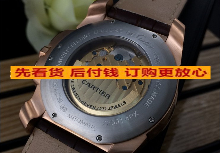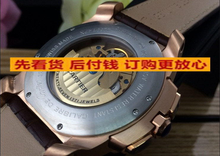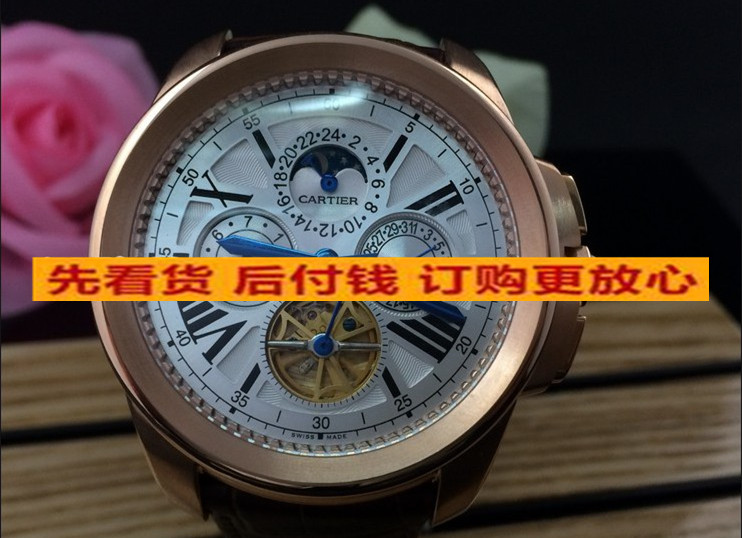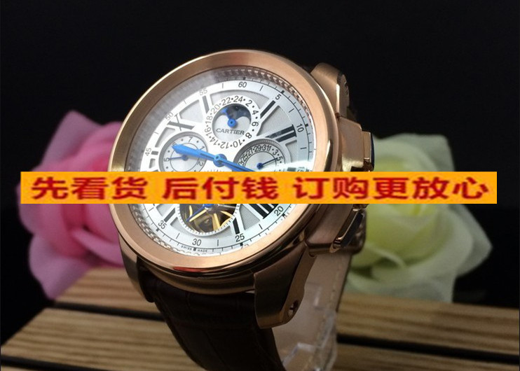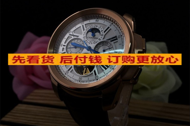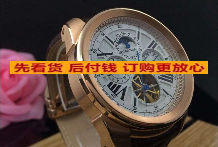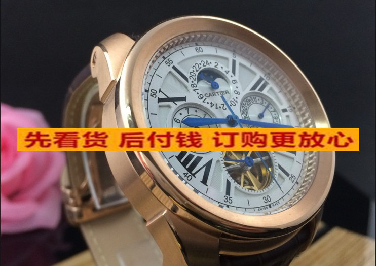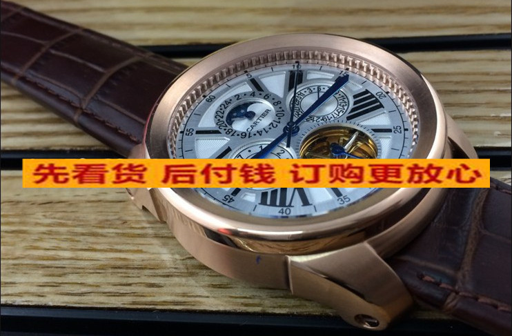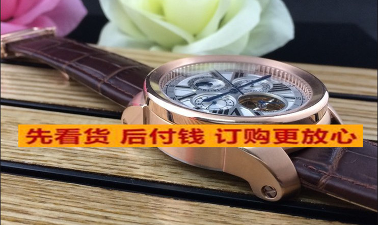 卡地亞 復雜款瑞士原裝機芯六針全玫瑰金帶飛輪日曆真皮錶帶機械男錶 適合粗胳膊人群