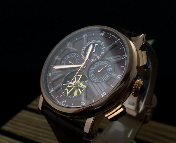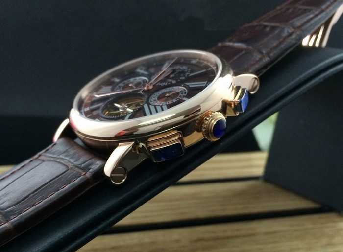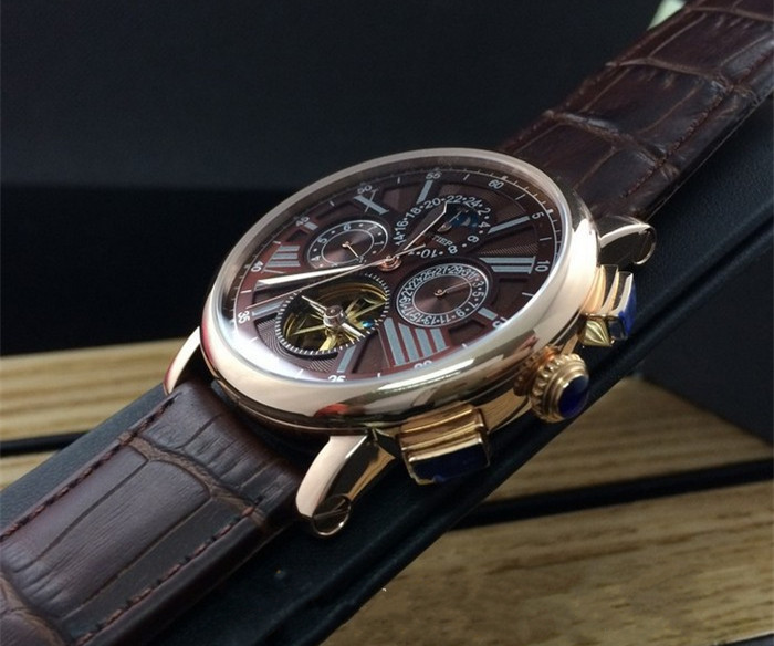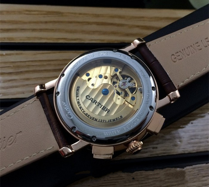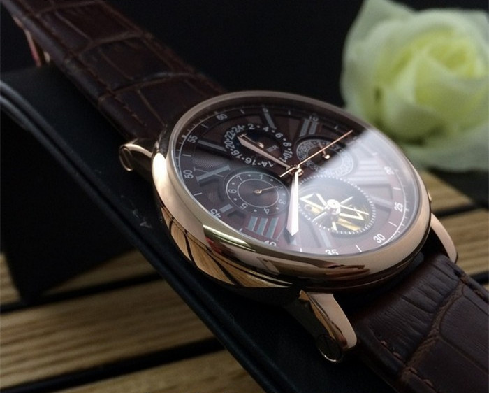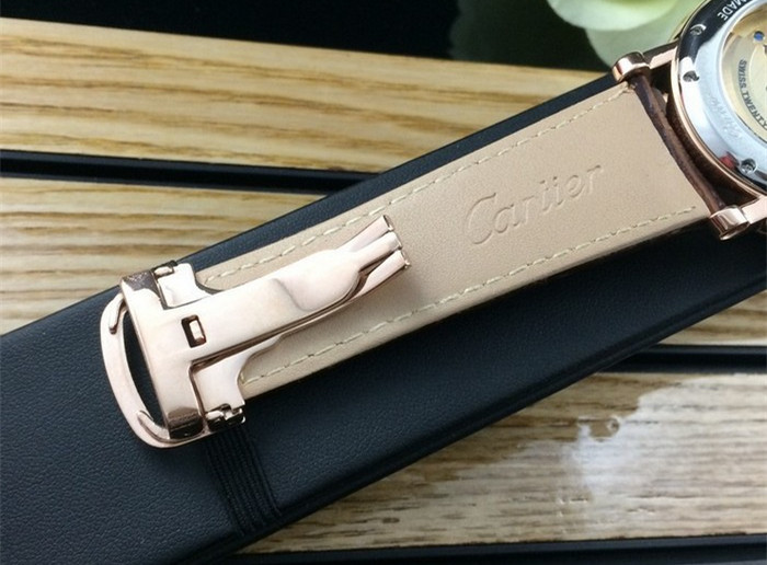 新款卡地亞經典復古玫瑰金六針陀飛輪真皮錶帶男機械錶