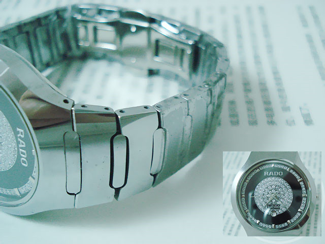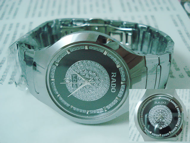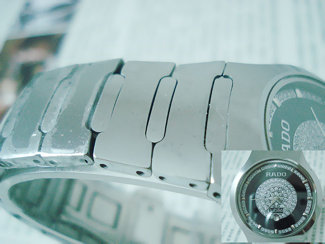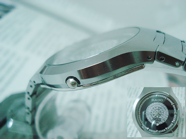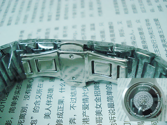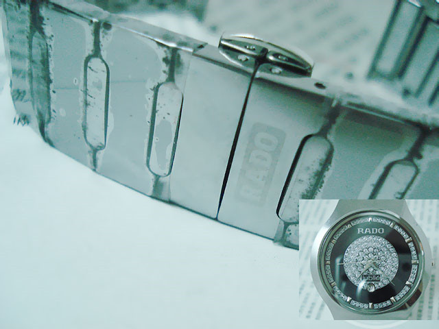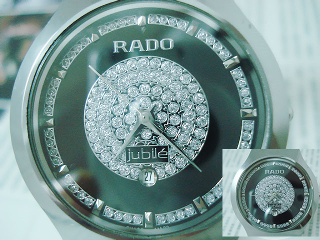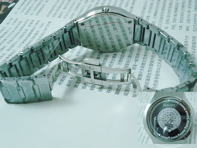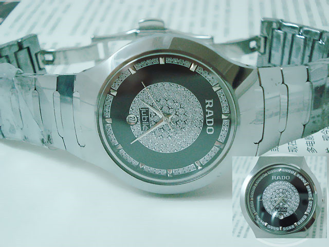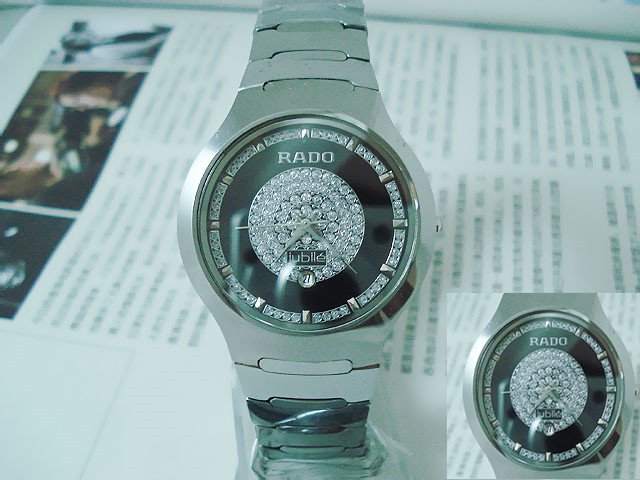 材質:鎢鋼錶殼、錶鏈 藍寶石高硬度錶面 捷克銀鉆日歷錶盤 RADO雙折疊錶扣 錶殼背面“RADO jubile”標誌