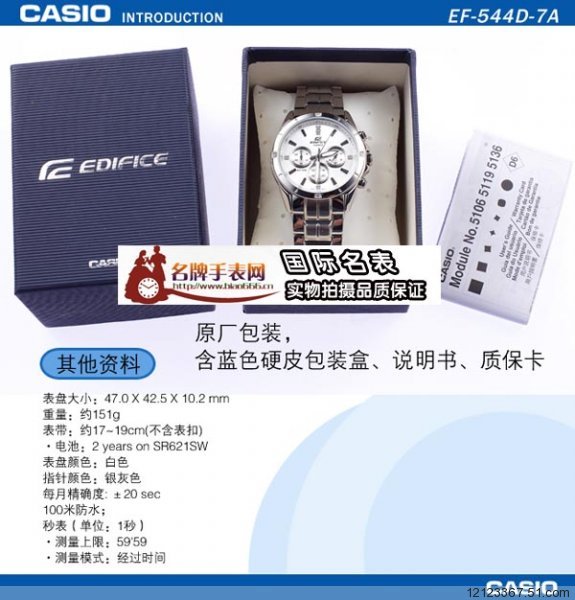 卡西歐 CASIO 尊貴華麗鑲水鉆三眼計時男錶EF-544D-7A(白)推出時間:2009.10官方價格:1390.00EDFICE系列EF-544與SHEEN系列SHN-1031情侶對錶新作。在不同部位鑲嵌水晶,營造豪華質感;備有2色可選,適合不同需求。紳士風格EDIFICE 璀璨獨特 三眼計時鉆錶。強調與眾不同的個人品味,雅痞質感多功能錶→紳士風格的EDIFICE系列錶款,率性個人品味錶款,創新錶盤內亮鉆設計雅痞質感,優雅內斂基本百款,潮流質感輕松打造時尚型男風。