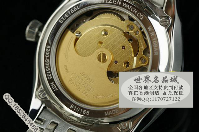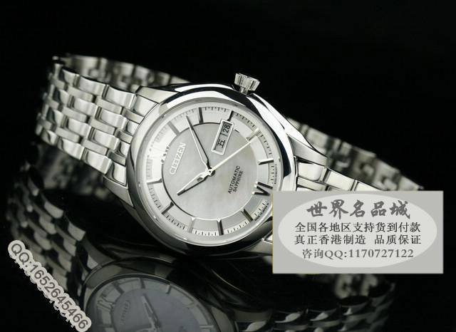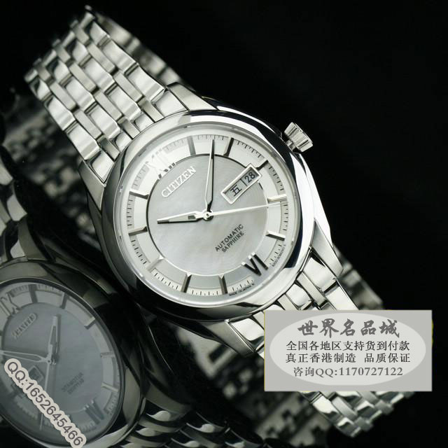 品牌:西鐵城(CITIZEN) 型號:NH8340-52AB機芯:全自動機械機芯 背透材質:高硬度耐磨藍寶石鏡面,全鋼錶殼錶帶,母貝水波紋錶盤功能:3針計時,雙日歷窗口顯示尺寸:錶殼38mm ,周長250mm ,厚度12mm ,錶帶寬度18-20mm,重約155g標誌:錶面、錶背、錶扣處有品牌logo標誌防水:50米(50米以上即:50米左右到300米防水)保修:機芯壹年保修,機芯以外的其他手錶配件不在保修範圍,此為手錶行業保修慣例,如有其他延期保修服務,請聯系店主咨詢。