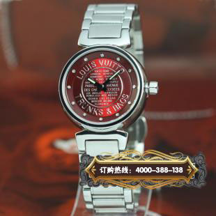 品牌:路易威登款式:女款厚度:約9mm尺寸:錶盤直徑:32mm錶盤:桃紅色錶盤,鑲鉆刻度,熒光指針錶帶:316L全精鋼錶帶錶殼:316L全精鋼錶殼防水:30米機芯:原裝瑞士石英機芯配件:原裝盒,說明書,質保卡,吊牌,香港發票鏡面:藍寶石水晶玻璃