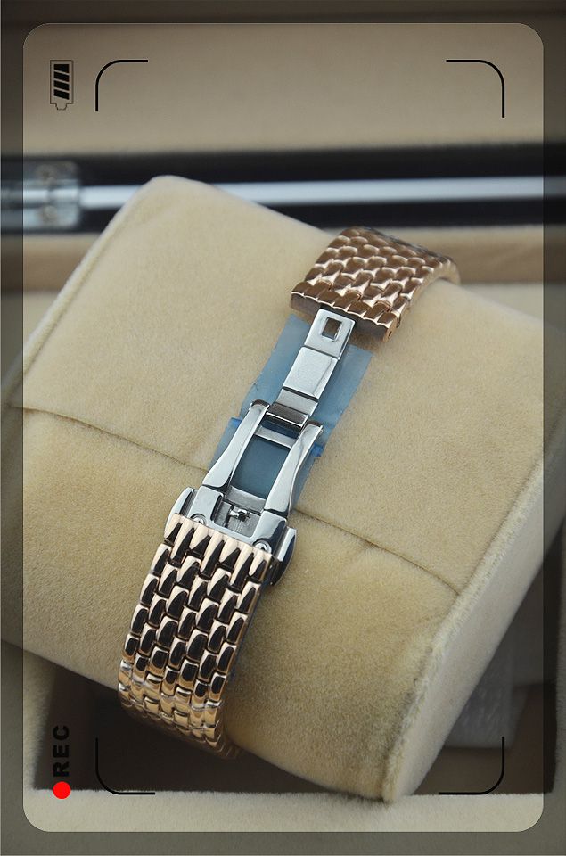 材質:高硬度耐磨藍寶石鏡面,全鋼錶殼,玫瑰金色錶圈,玫瑰金全散珠錶帶,蝴蝶雙按扣,白色錶盤,黑色錶針,數字刻度