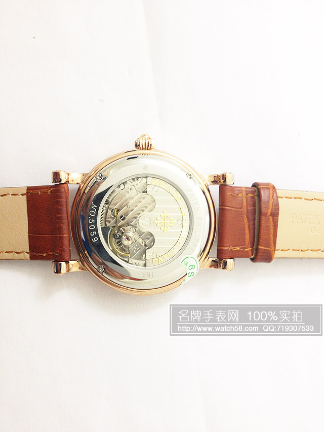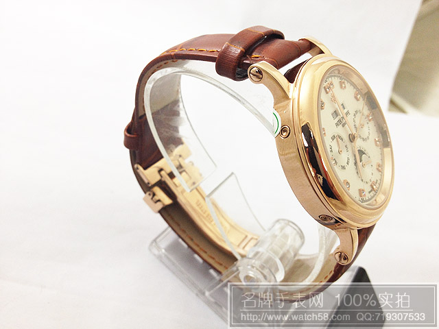 【功能】生活防水、防震、防磁;多功能顯示,小圈分別顯示星期\日曆\24小時,上方雙天窗萬年曆顯示年份\月份,阿拉伯數字玫瑰金錶盤顯示;背透雕刻機心清晰可見,這個也是只有號稱世界十大名錶之首的百達翡李獨特設計之處!。