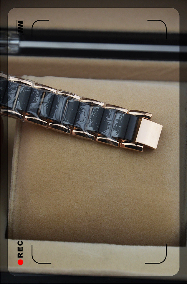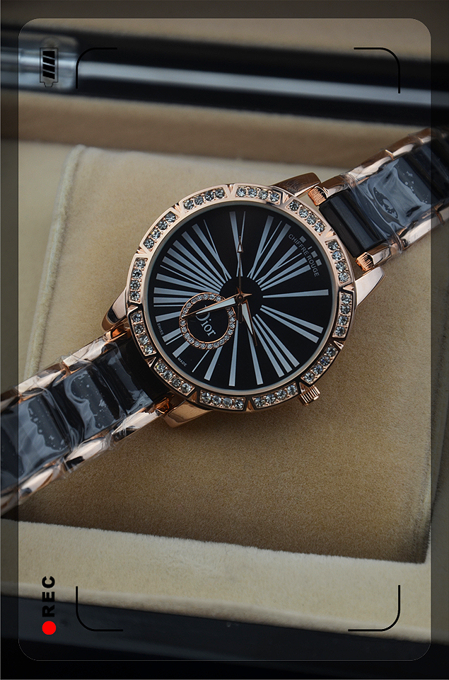 材質:高硬度耐磨藍寶石鏡面,全鋼錶殼,金色錶圈,精鋼間金全散珠錶帶,按扣,黑色錶盤,金色錶針