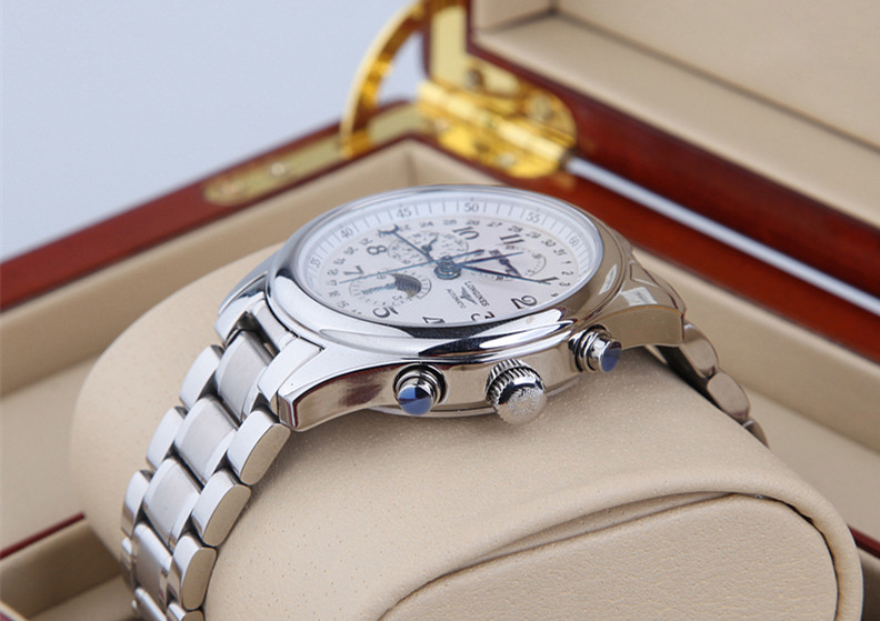 系列:名匠系列款式:男錶機芯:瑞士進口全自動雕花機芯錶殼:316精鋼尺寸:40mm厚度:15mm錶底:透底錶鏡:藍寶石水晶錶盤:白色錶帶:鋼帶錶帶顏色:銀色錶扣:蝴蝶扣防水:30米包裝:精美包裝盒、說明書、保修卡等功能:日期顯示 星期顯示 月份顯示 月相 計時碼錶 雙時區