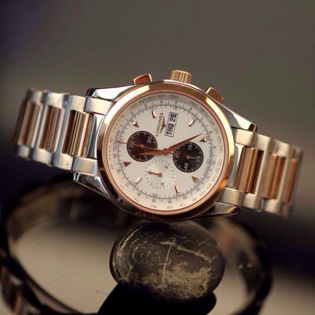 浪琴多功能白色錶盤,六針款,間金錶鏈,浪琴男士機械腕錶