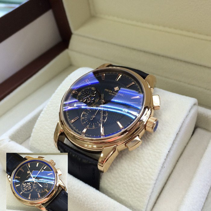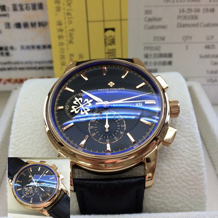 【品牌】:百達翡麗(PATEK PHILIPPE)【產地】:香港組裝【款式】:男士機械手錶【機芯】:原裝進口全自動機械機芯【錶面】:法國玻璃藍寶石鏡面,永不磨損。莫氏9級藍寶石錶面【材料】:進口瑞士玫瑰金錶殼 法國小牛皮錶帶,永不掉色、永不生銹,高精度藍寶石玻璃永不劃損【尺寸】:直徑:43MM,厚度:13MM【標誌】:錶面、錶背、錶扣均有原廠標誌【功能】:30米防水、防震、防磁【附件】:原裝包裝盒、吊牌、保質卡、說明書、香港發票