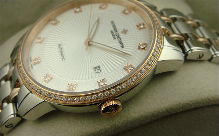 江詩丹頓Vacheron Constanti傳承系列玫瑰金鋼鑲鉆透底白面自動機械男錶瑞士ETA2824