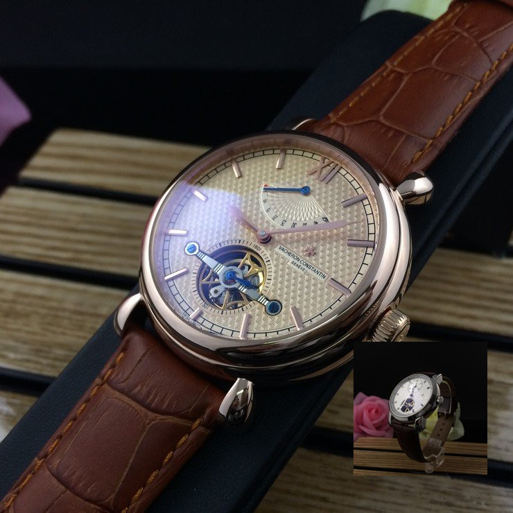 江詩丹頓 玫瑰金精鋼錶殼真皮錶帶陀飛輪男士機械手錶