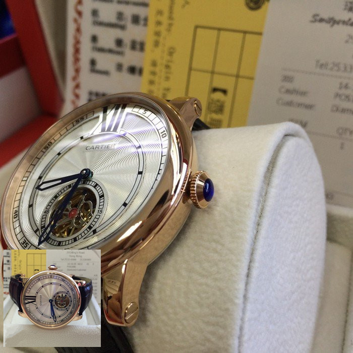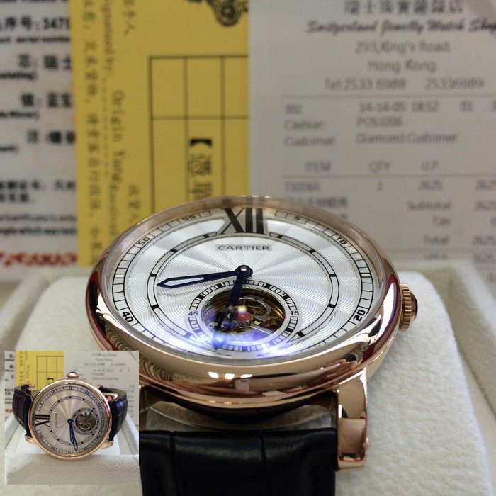 【品牌】:卡地亞 (Cartier)【產地】:瑞士【款式】:男士機械手錶【機芯】:進口機械機芯 【錶面】:法國玻璃藍寶石鏡面,永不磨損。莫氏9級藍寶石錶面【材料】:進口瑞士玫瑰金錶殼 法國小牛皮錶帶,永不掉色、永不生銹,高精度藍寶石玻璃永不劃損【尺寸】:尺寸:錶殼43mm ,厚度13mm ,重量128g【標誌】:錶面、錶背、錶扣均有原廠標誌【功能】:30米防水(可遊泳)、防震、防磁【保修】:三年保修【附件】:原裝包裝盒、吊牌、保質卡、說明書、香港發票