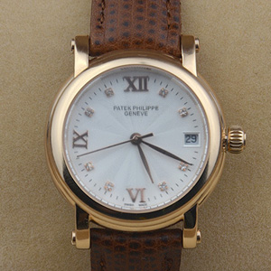 品牌:百達翡麗女款機芯:瑞士石英機芯 材質:高硬度耐磨藍寶石鏡面,全鋼錶殼,玫瑰金色錶圈,真皮錶帶,卡針扣,白色錶盤,金色錶針,鉆石刻度功能:3針計時,日歷顯示尺寸:錶殼31.8mm,厚度9.9mm ,重量40g標誌:錶面、錶背、錶帶處有品牌標誌防水:生活防水(生活防水即:防賤發、雨水等壹類遇水時間短,壹過性的遇水情況,遇水請及時甩幹或抹幹)保修:機芯壹年保修,機芯以外的其他手錶配件不在保修範圍,此為手錶行業保修慣例,如有其他延期保修服務,請聯系店主咨詢。