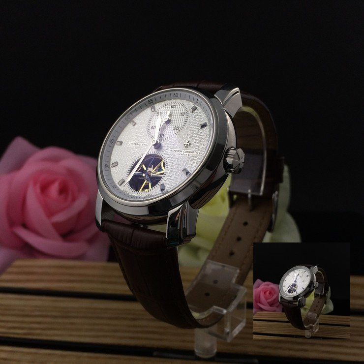 江詩丹頓 精鋼銀面陀飛輪瑞士機械男款棕色真皮錶帶-WATCHES1744
