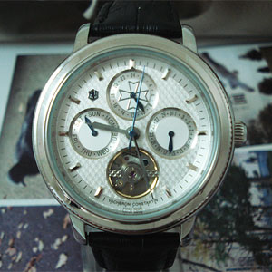 尺寸:直徑 4.2CM 厚度 1.3CM 機芯:進口白色雕花自動上鏈機芯功能:計時、日歷、防水、防震 材料:不銹鋼高拋光錶殼 意大利小牛皮錶帶錶面:高耐磨損鍍膜防暄平面玻璃 標誌:錶面/錶帶/錶扣/把蒂均有清晰Vacheron Constantin標誌.特點:精致制作陀飛輪 長體酒桶式錶體顏色:白面黑帶 江詩-丹頓是世界著名鐘錶品牌,成立於1755年,其錶盤上的如瑞士國徽般的十字標記,已經是品位、地位和財富的象征。