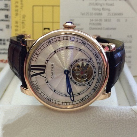 【品牌】:卡地亞 (Cartier)【產地】:瑞士【款式】:男士機械手錶【機芯】:進口機械機芯 【錶面】:法國玻璃藍寶石鏡面,永不磨損。莫氏9級藍寶石錶面【材料】:進口瑞士玫瑰金錶殼 法國小牛皮錶帶,永不掉色、永不生銹,高精度藍寶石玻璃永不劃損【尺寸】:尺寸:錶殼43mm ,厚度13mm ,重量128g【標誌】:錶面、錶背、錶扣均有原廠標誌【功能】:30米防水(可遊泳)、防震、防磁【保修】:三年保修【附件】:原裝包裝盒、吊牌、保質卡、說明書、香港發票