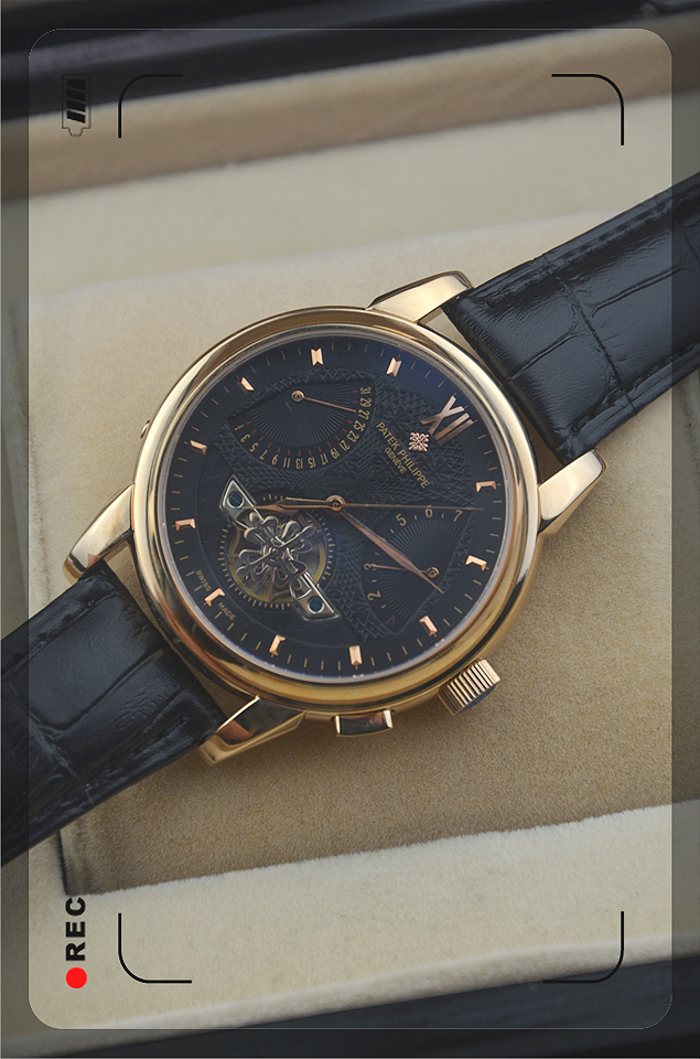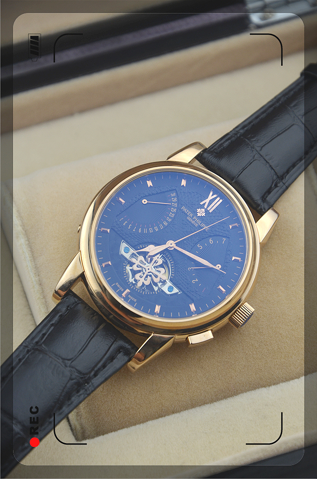 百達翡麗蒼穹圖全自動機械錶3針旋轉秒盤黑色皮帶男士手錶藍色錶盤-WATCHES385