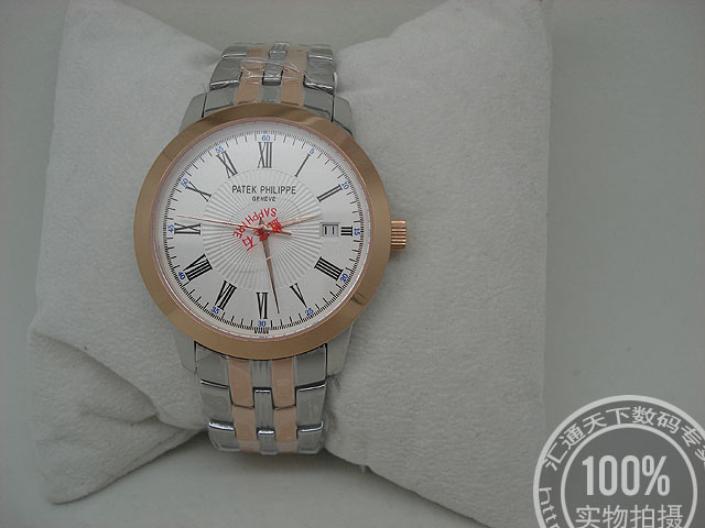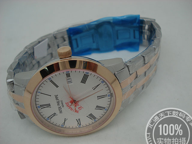 百達翡麗精鋼間玫金3針日曆藍針高精自動機械男錶手錶