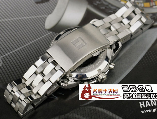 天梭精鋼全散珠6針日曆黑盤背透自動機械男錶