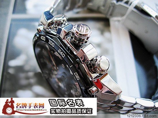 3點鐘方向為24小時時間顯示;6點鐘方向為雙向碼錶;錶盤設計融入F1元素;部分位置有IP塗