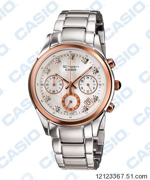 CASIO Sheen系列-閃耀眾人目光奢華版 時尚都會三眼計時碼錶功能女錶-面板上貴氣的閃耀亮鑽點綴的優雅迷人:閃耀光芒的亮鑽點綴於時間刻度上;玫瑰金色鏡面處理的指標、面板上優雅的光芒紋路、以及銀色鏡面處理的錶殼/錶帶,讓佩戴者不覺中散發出奢華高貴的氣息。