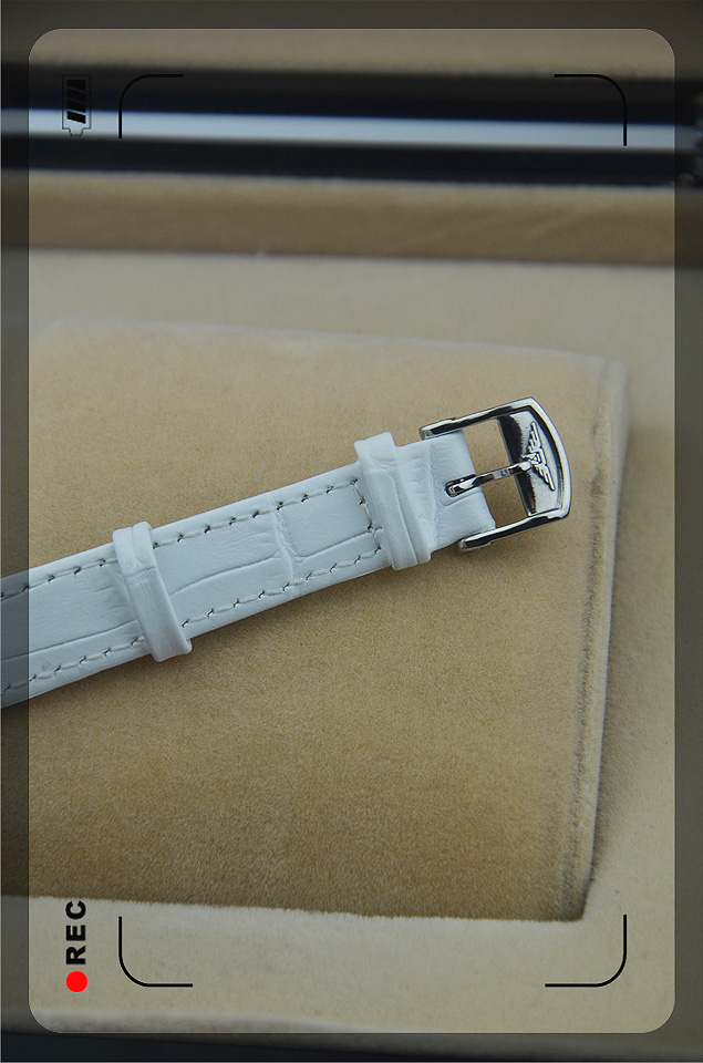 材質:高硬度耐磨藍寶石鏡面,全鋼錶殼,銀色錶圈,真皮錶帶,針扣,貝殼面,黑色錶針